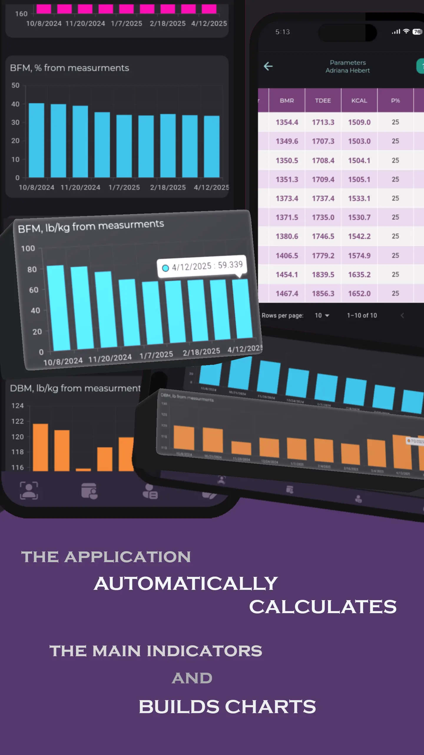 - Automatic calculation of BMI (body mass index), BMR (basic metabolism rate), TDEE (total daily energy expenditure), lean body mass, loads and totals of proteins, fats and carbs and etc.